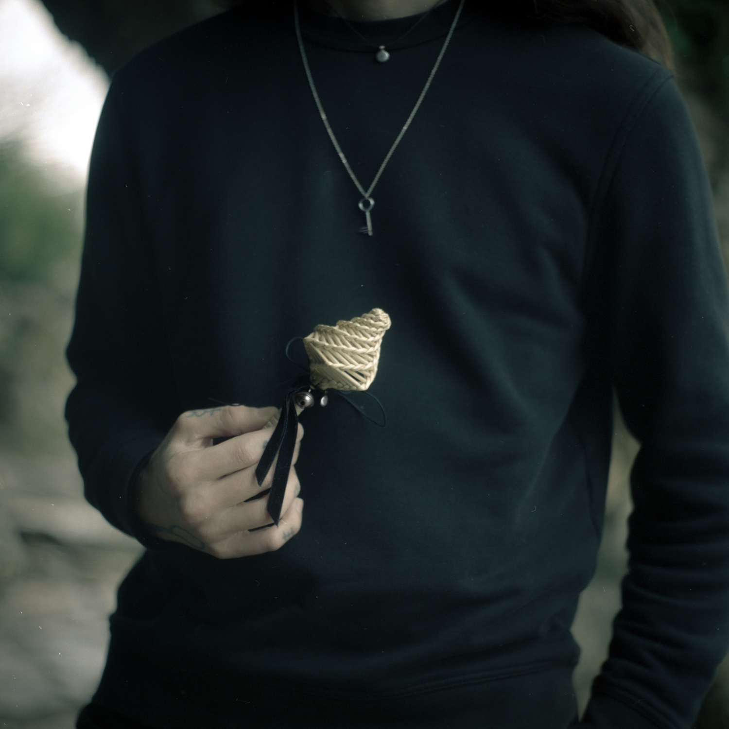 Un talisman Key to Hell, une amulette Sombre Graal et un médaillon Rustique portés avec quelques bagues Shízhánee’, des Baguettes de Rhabdomancie et un hochet Crepitacula (tressé par Les.Nuances.Fauves, orné d’un médaillon Rustique).