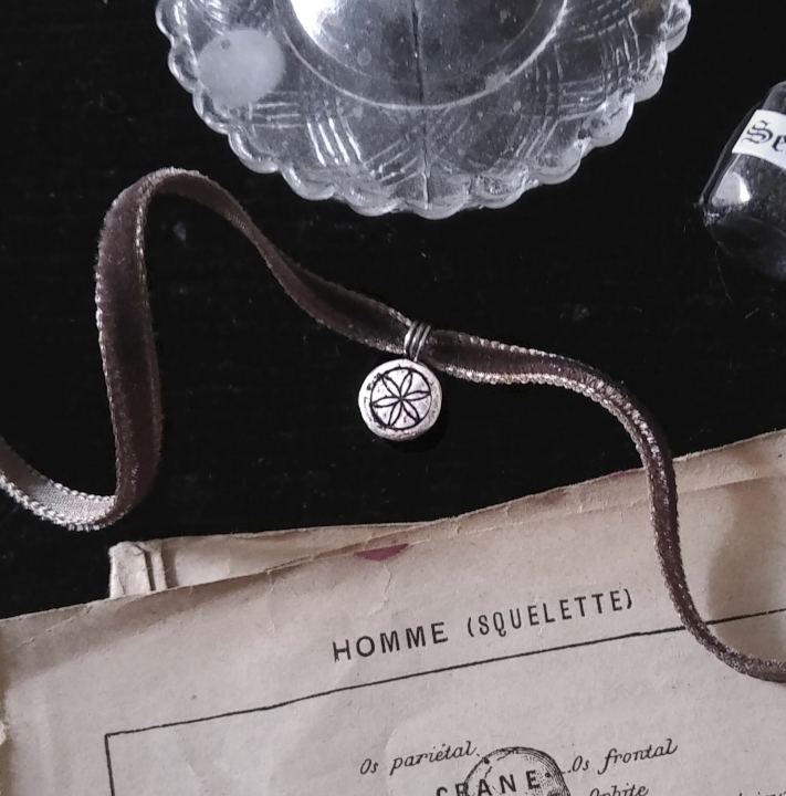 DAISY-WHEEL MEDALLION. ANTIQUED HEIRLOOM ✷ sustainable sterling silver – chain or ribbon