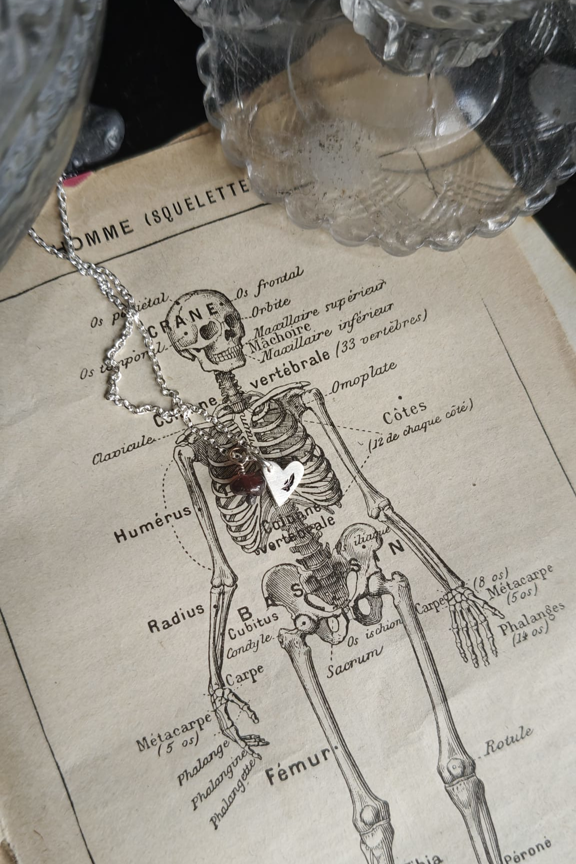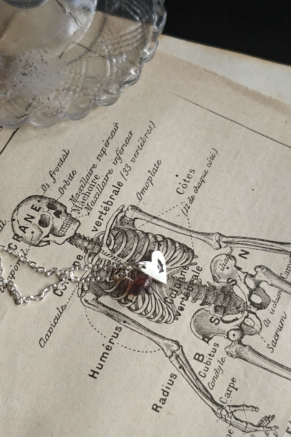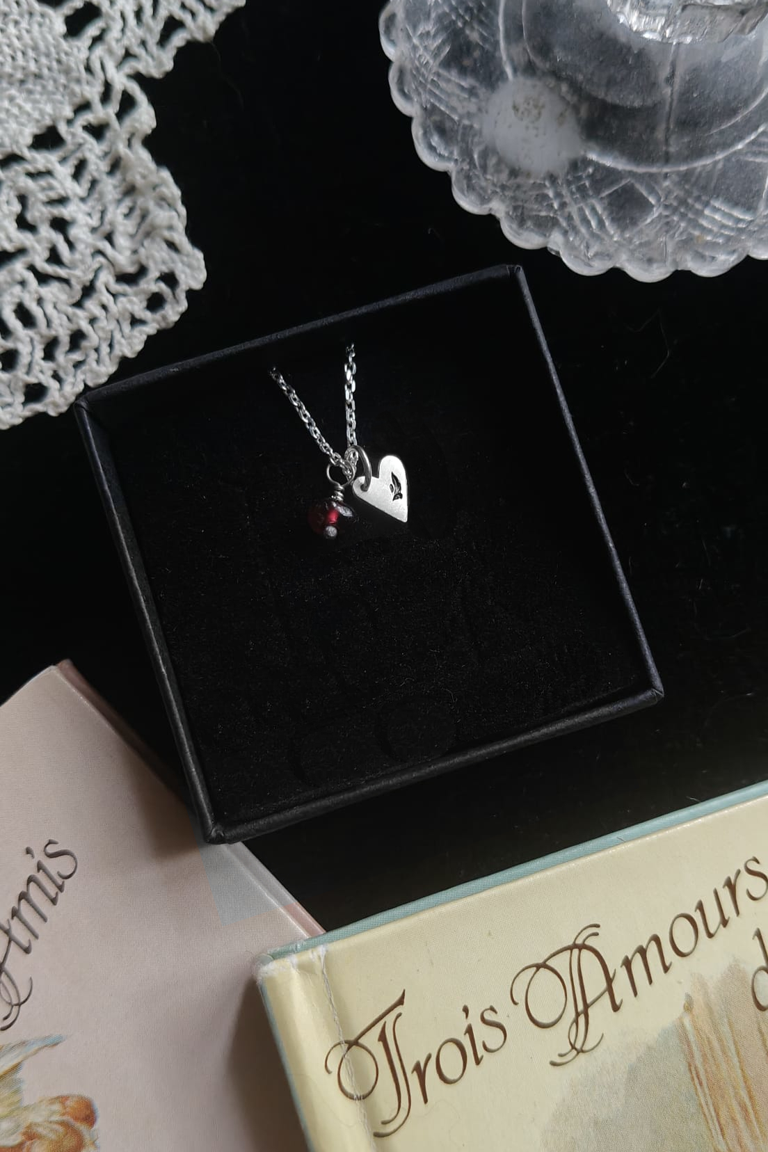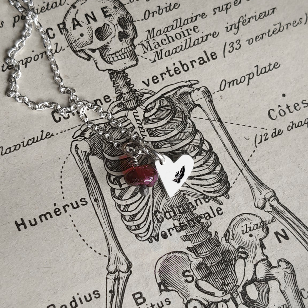 MON SEVL DÉSIR. AMULETTE CORDIFORME – argent recyclé et perle vintage de grenat ou d’ambre.