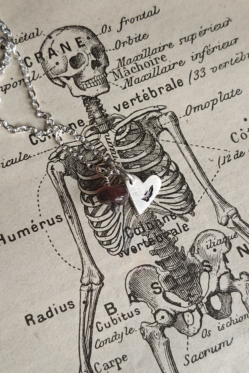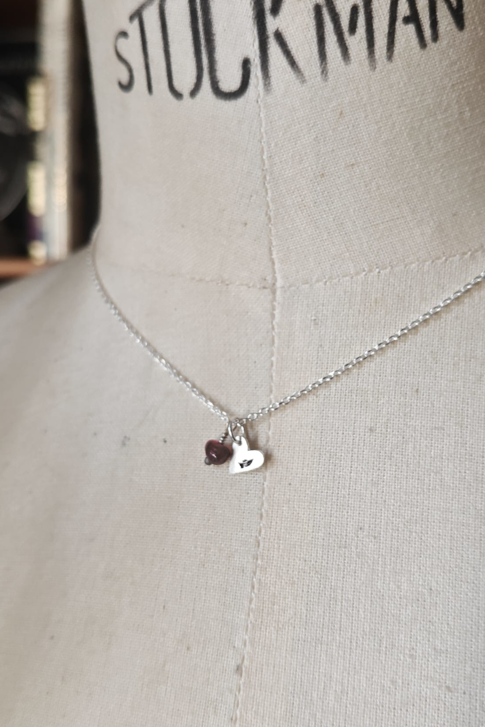 MON SEVL DÉSIR. CORDIFORM AMULET ✷ sustainable sterling silver & garnet or amber bead ✷ sustainable sterling silver – with a leaf or letter & pre-loved garnet or amber bead